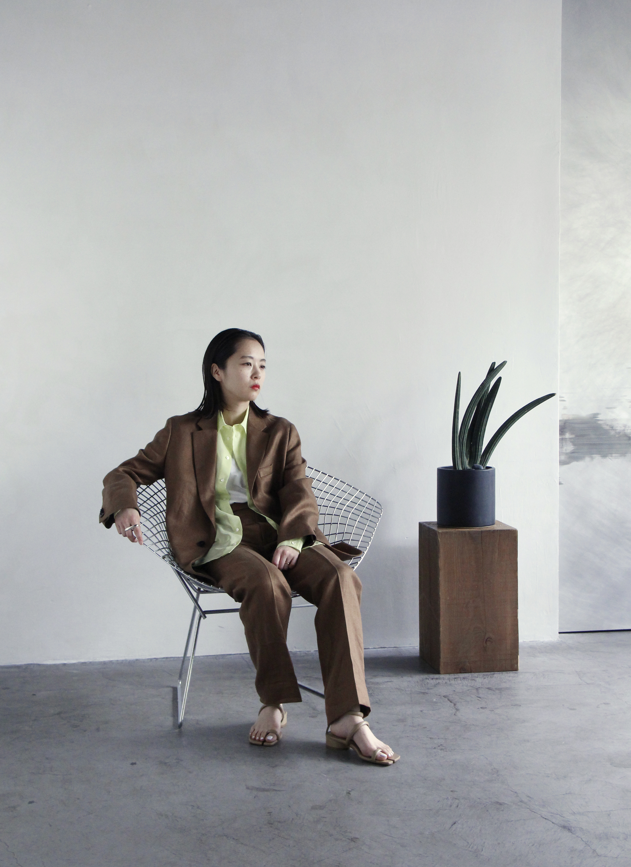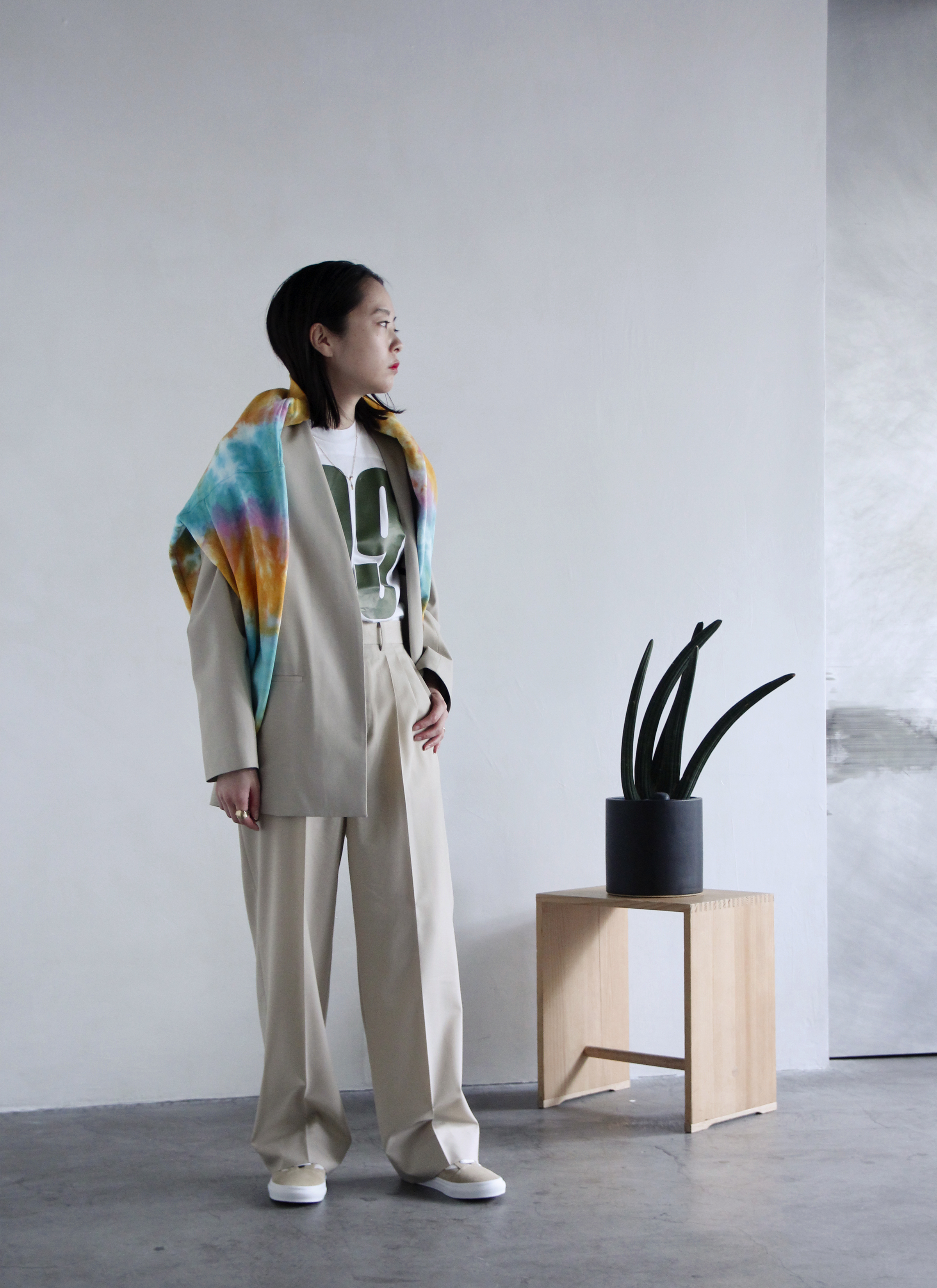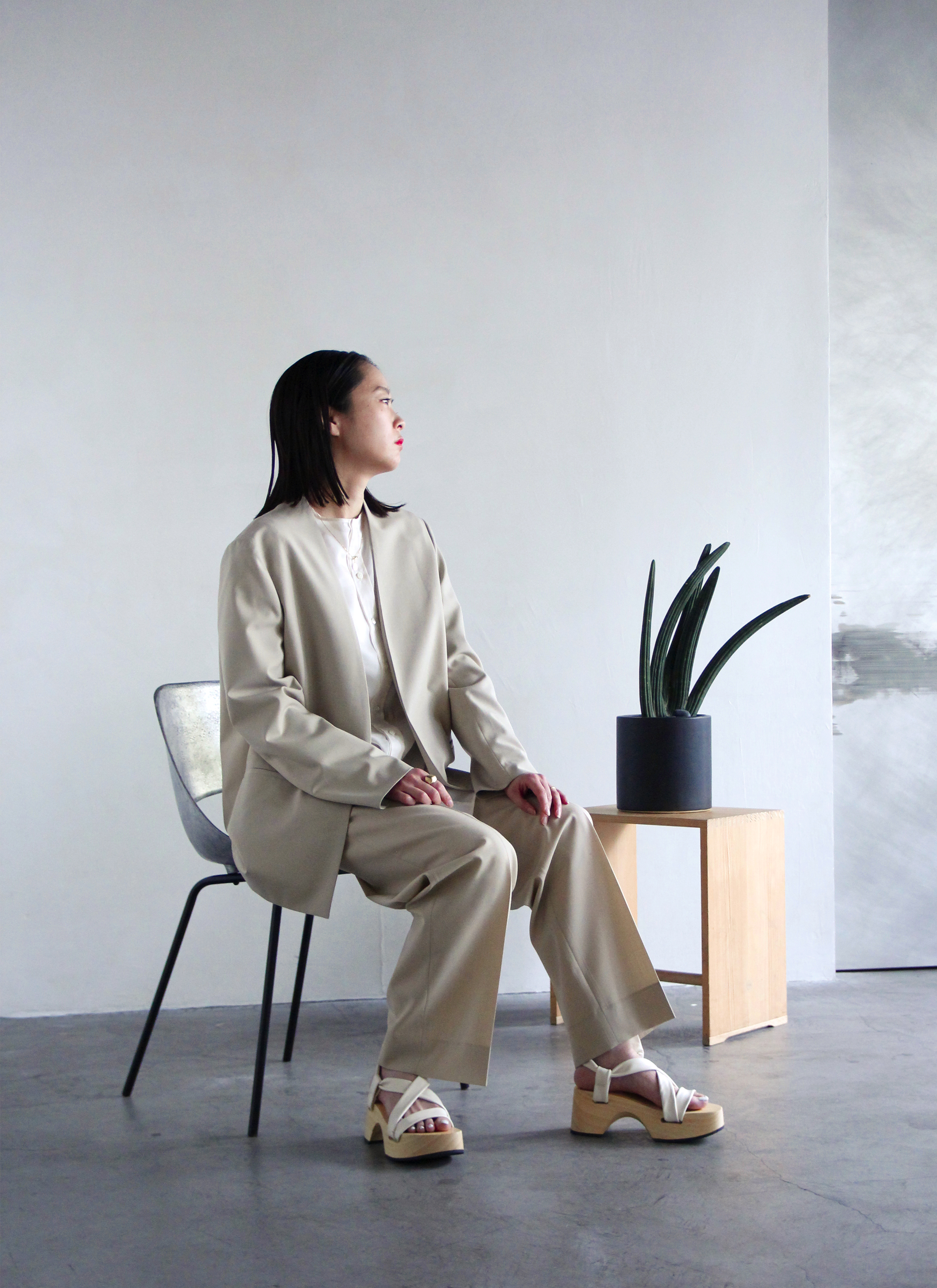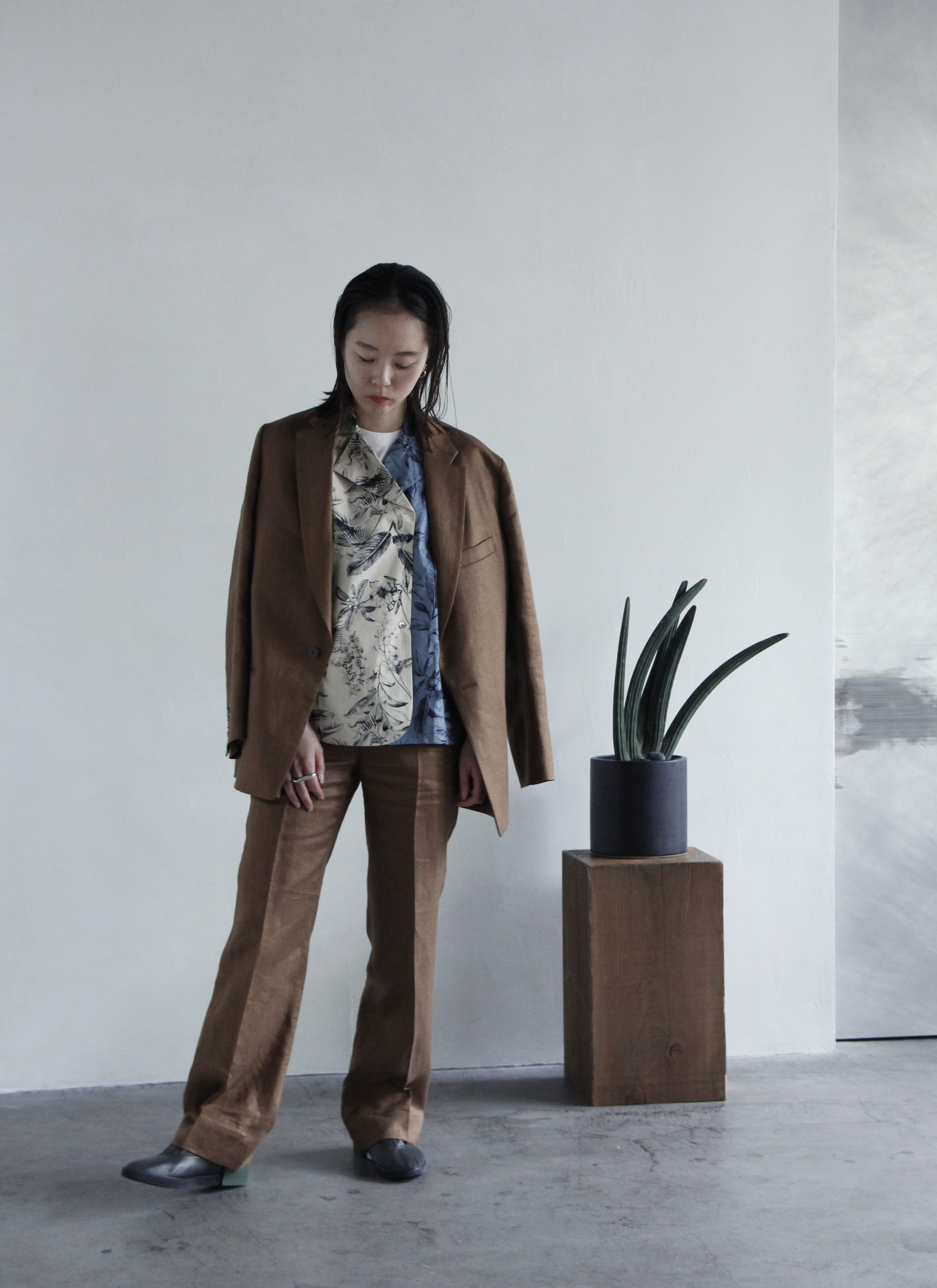 続いてのスタイルは光沢感のある柔らかいリネン素材を使用したセットアップ。