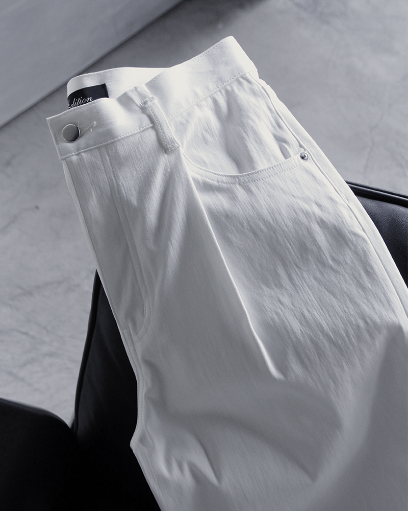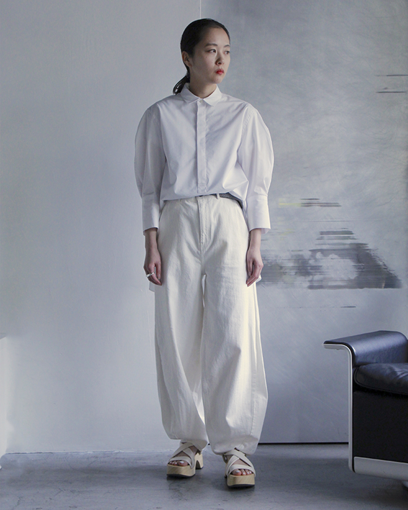 白一色のスタイリングで活躍する存在感のあるパンツです。