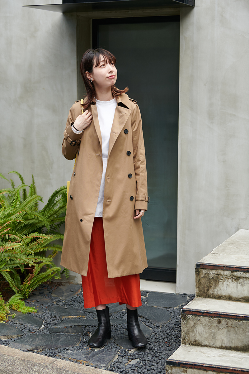 小物をトレンチコートと同じベージュトーンで合わせることで、全体に統一感を出しました。